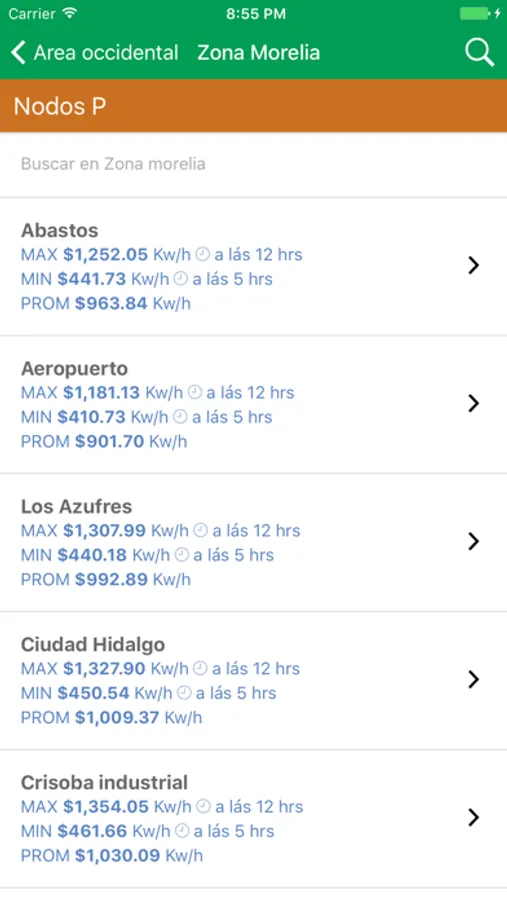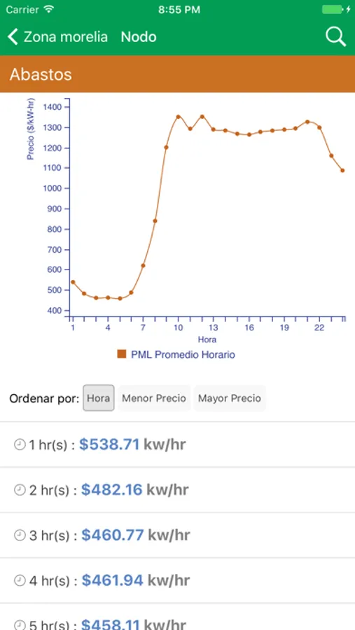 - PML para los 2300 Nodos P del Sistema Eléctrico Mexicano expresados de manera horaria a través de un listado y de una gráfica con la opción para ordenarlos de mayor a menor y viceversa.