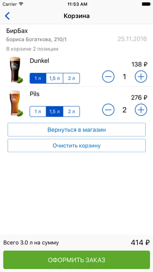 Вы сможете просмотреть список магазинов, торгующих напитками на розлив, а также найти подробную информацию о предлагаемых напитках. Просто выберите предпочитаемый напиток, объем бутылки и время, к которому в магазине подготовят ваш заказ. Теперь вам не придется тратить время на очереди и ждать, пока продавец обслужит вас. Заказ будет ждать вас заранее!