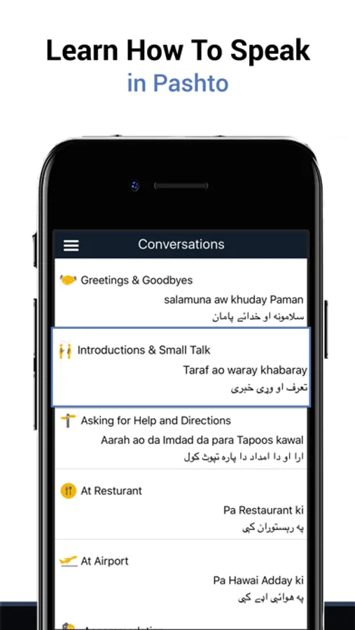 • Conversation: No one can master a language until be able to converse in it. The conversation part covers Pashto greetings, helping sentences, public and restaurant conversation along introduction and small talks.