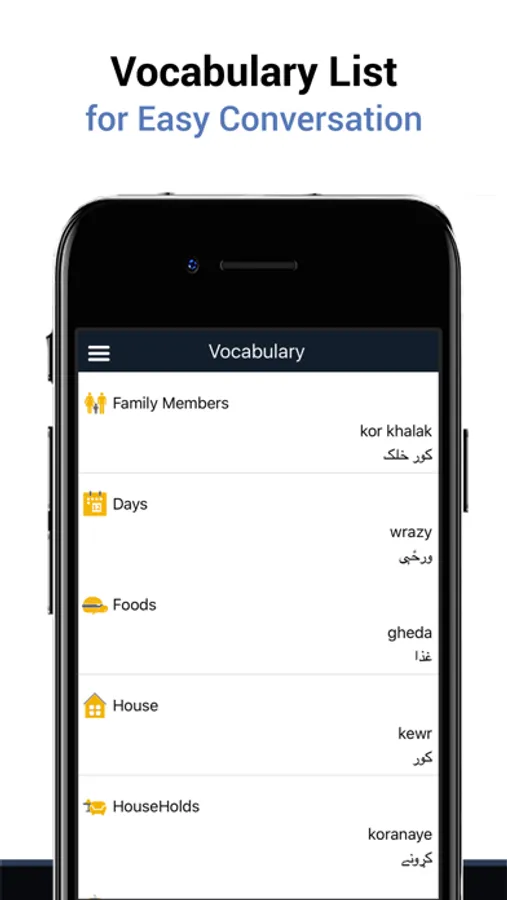 • Vocabulary: Vocabulary contains the significant parts of Pashto literature, which further is divided into other sections to familiarize the user with the daily use of words.