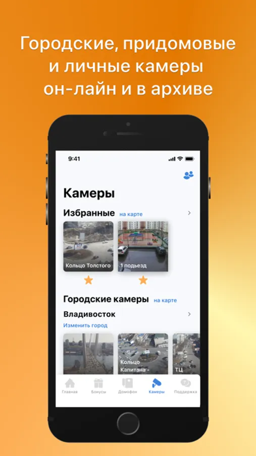 Просматривать городские, придомовые и личные камеры – добавляйте самые важные камеры в избранное, просматривайте видео в архиве до 7 дней (доступно скачивание архивной записи). Выдавайте доступ к просмотру ваших придомовых и личных камер тем, для кого это важно.
