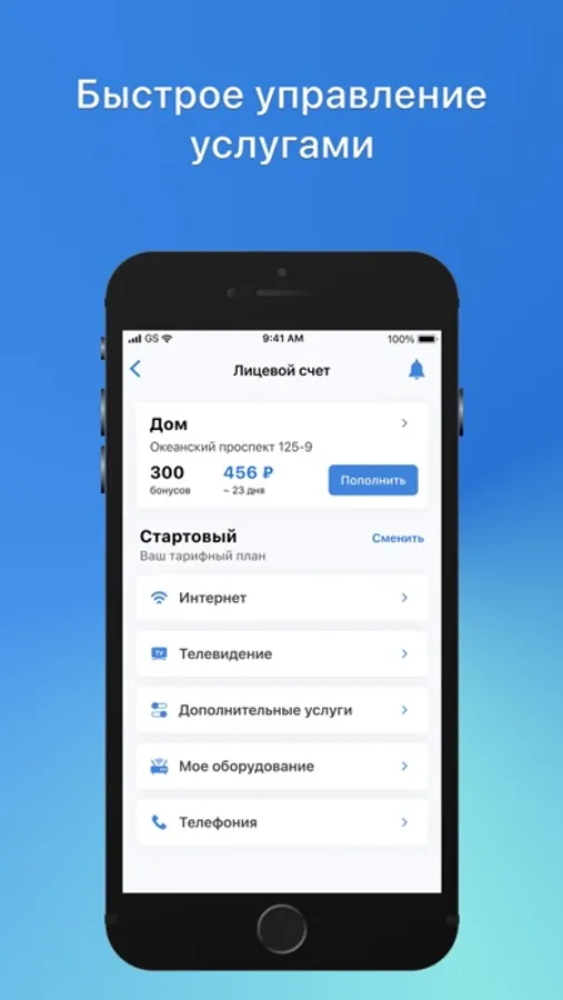 Управлять тарифом и услугами - меняйте тарифный план, подключайте дополнительные услуги или пакеты телеканалов одним кликом, активируйте абонементы на услуги не выходя из дома и не обращаясь в контактный центр.