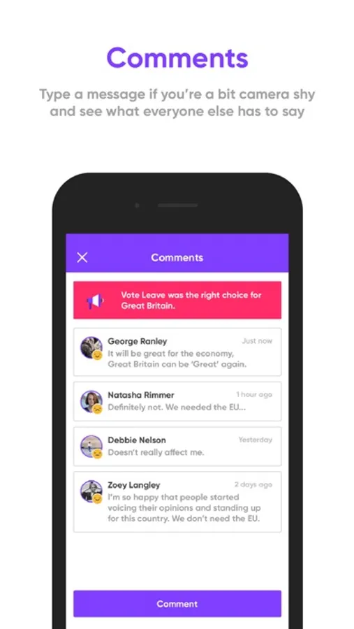 Debate is the social app for discussing the serious and not so serious news of the day. Upload a video or text response to some of the big questions you keep hearing and see the results in a fun and interactive manner.