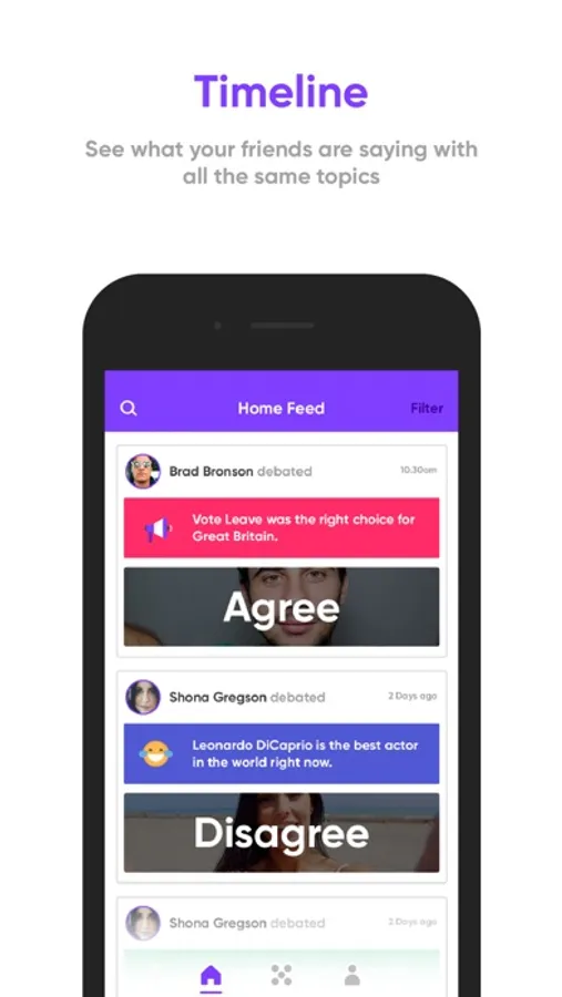 Scroll through a timeline of your friends and followers to see what they think about the Debates and get a sneak peek into what the country is thinking on the topics important to you. Debate creates a fun and balanced platform for you to put your point across in a new and dynamic manner which, and for the first time, enable you to see real time results of what the nation thinks.