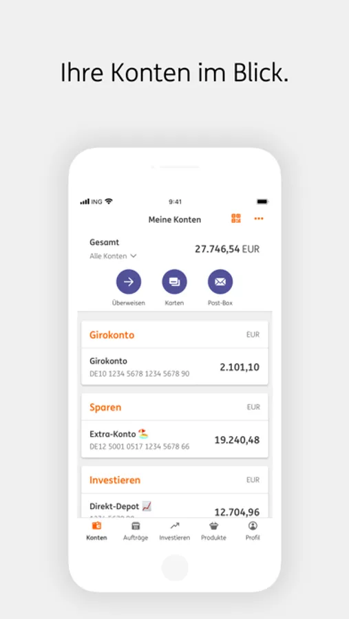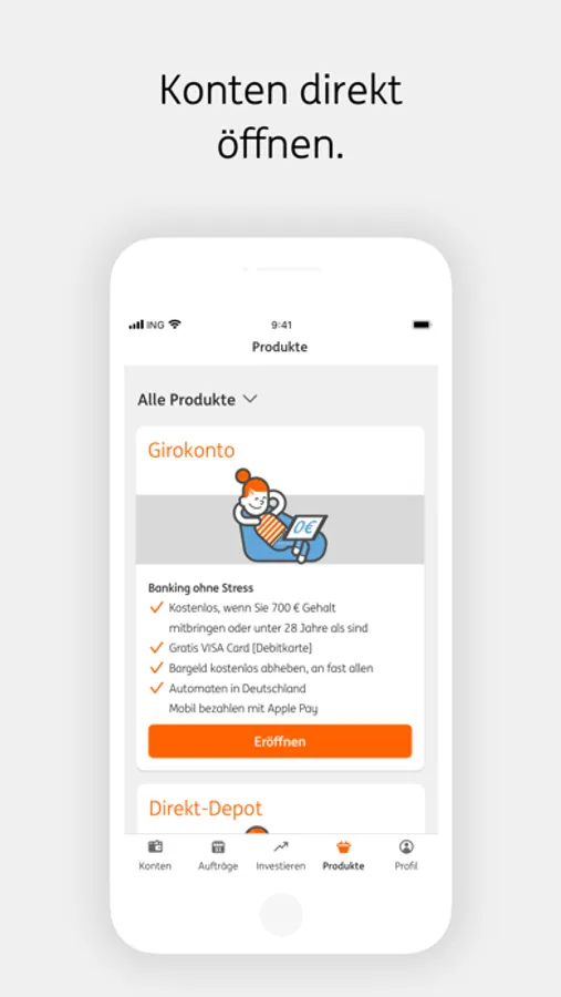 - Für ING Neukunden: Einfache Girokontoeröffnung inklusive Legitimation und Selbstvergabe der Banking-Zugangsdaten.