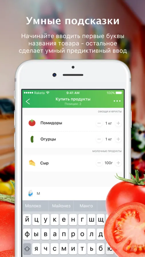 • Умный предиктивный ввод. Приложение предлагает вам варианты товарной позиции, основываясь на первых введенных буквах, и “запоминает” ваши предпочтения, чтобы в будущем вы могли добавлять привычные продукты ещё быстрее.