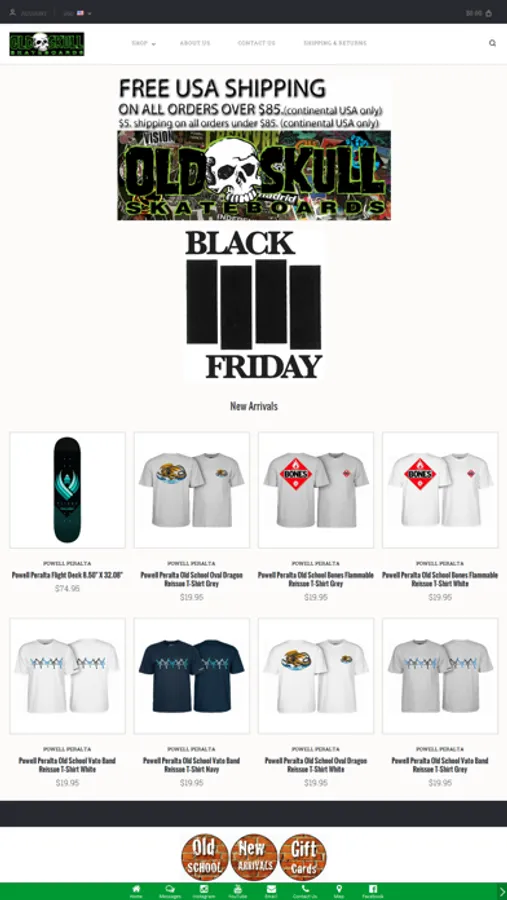 Oline Skateboard Shop selling Skateboards, Clothing, Shoes and Accessories. Specializing in Old School Skateboards, Clothing, Wheels, Trucks, Bearings and Accessories as well as new current brands. We offer Free Shipping on all orders over $85 in the Continental USA and $5. flat rate shipping on all orders under $85.