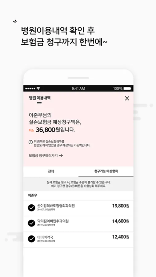 - 실손 보험금 청구 가능액 안내 및 모바일 보험금 즉시 청구