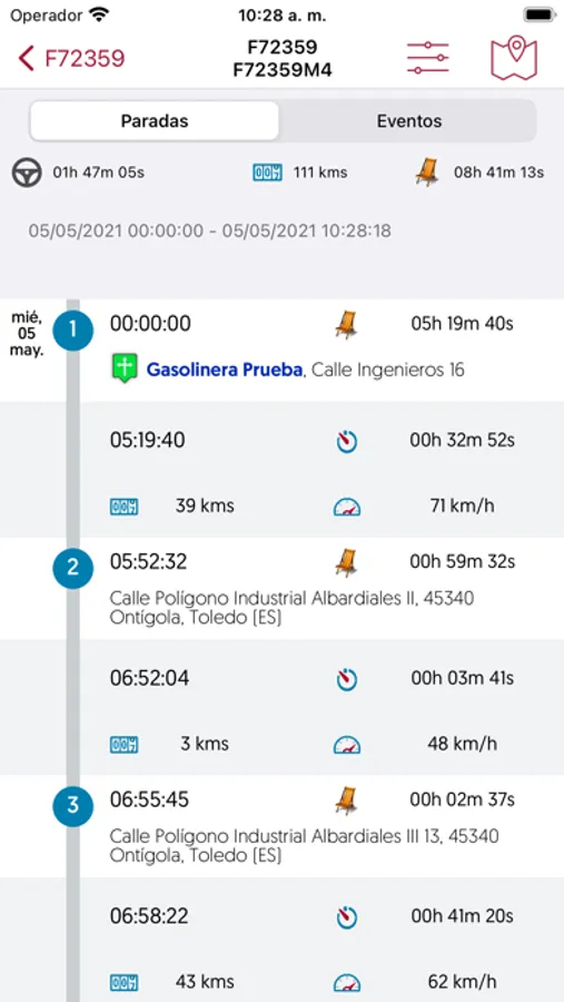 - Información del Viaje: hora de llegada al punto de parada, hora de salida del mismo, tiempo de estancia en el punto, velocidad media del viaje, y distancia recorrida en ese viaje