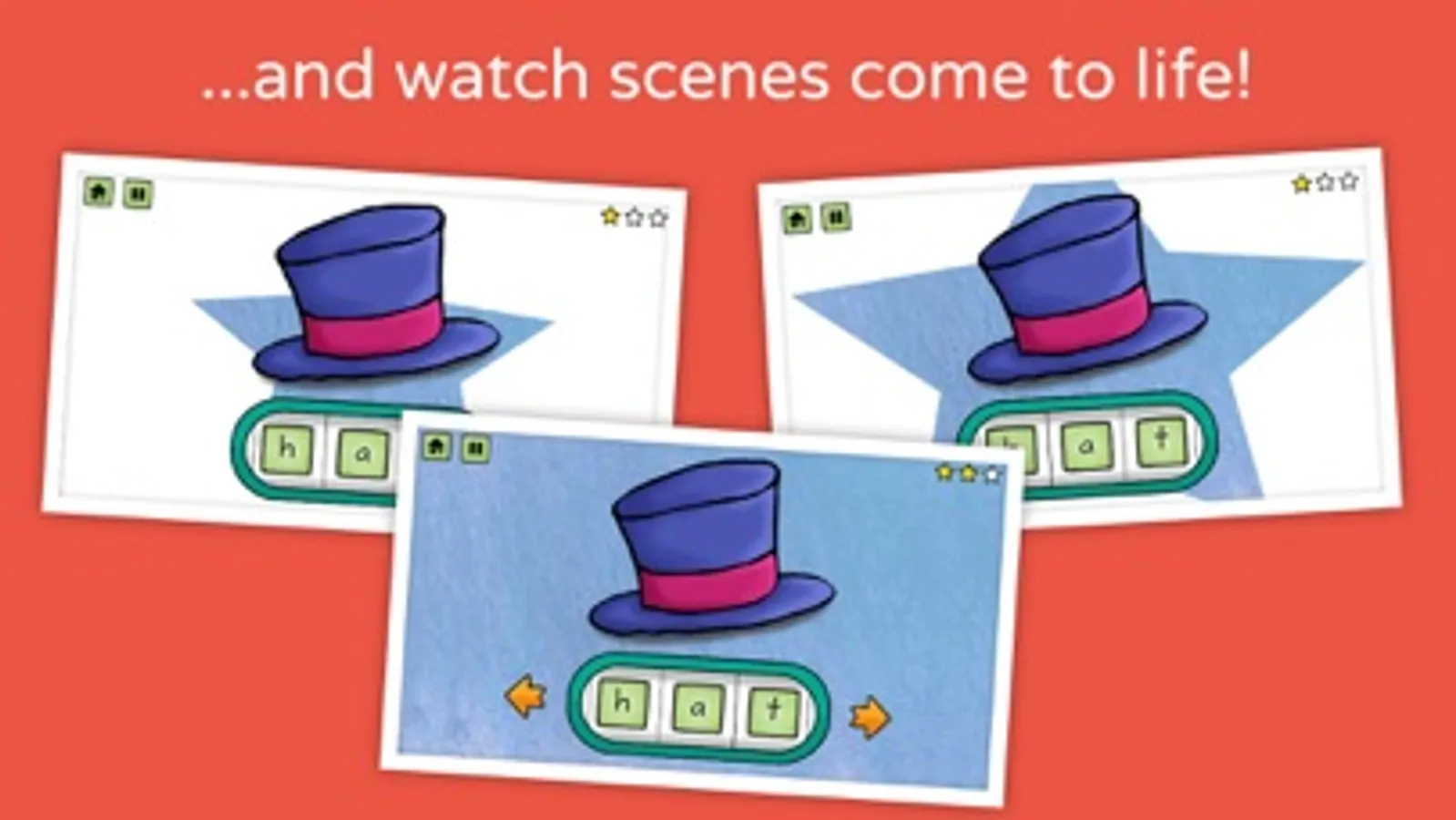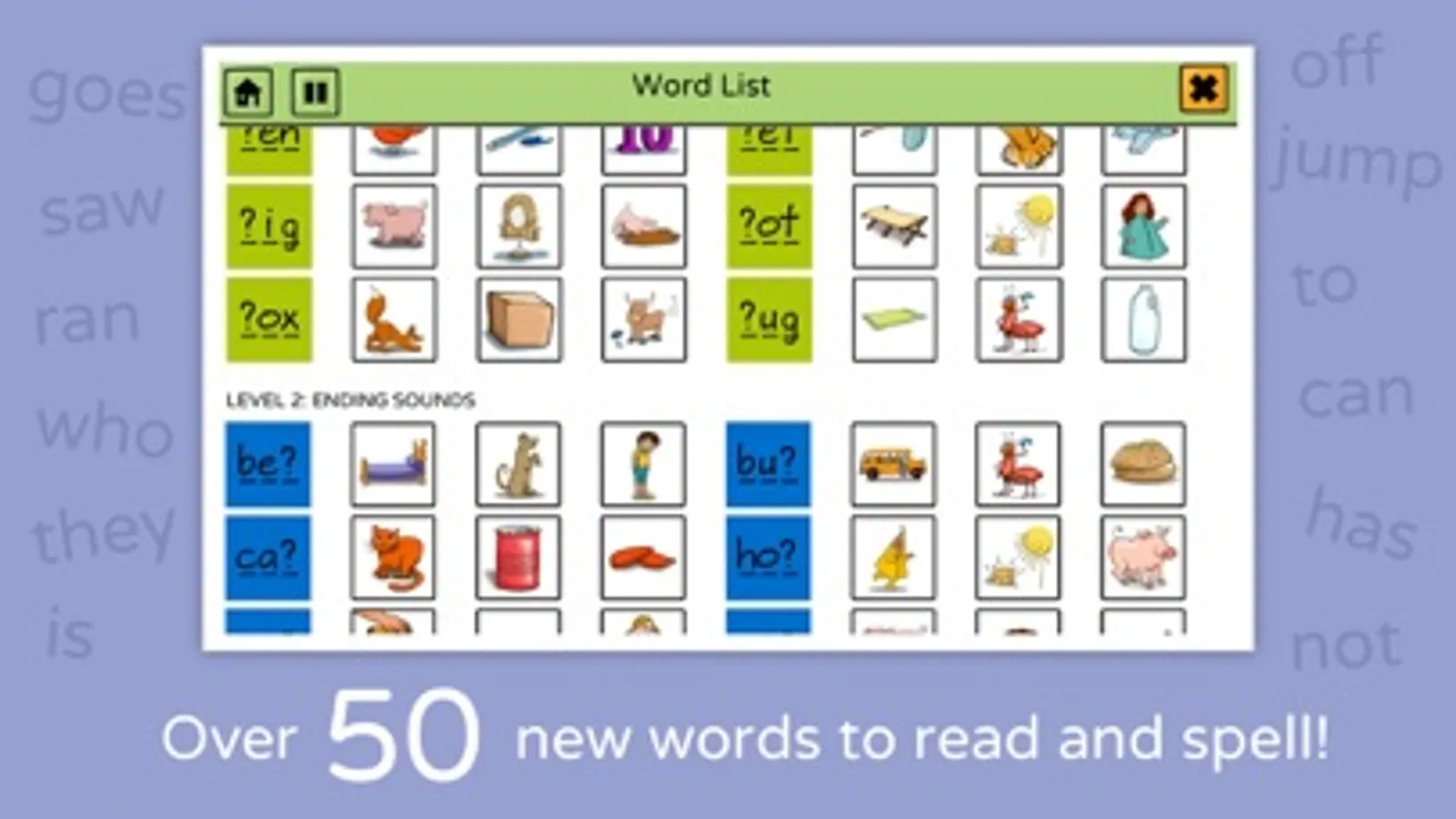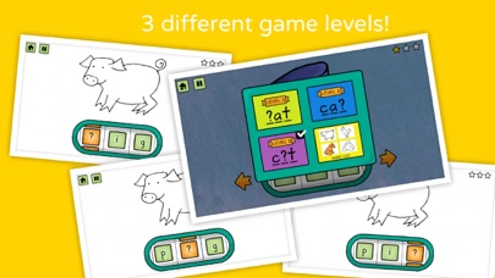 Players spin the dial to complete a word, focusing on either the beginning, ending or middle sound. Every word that players spell successfully colors in a new picture on their word list. After players spell three different rhyming words, a new word family is introduced. Through breaking words down into their beginning and ending sounds, players will master spelling 50 new words.