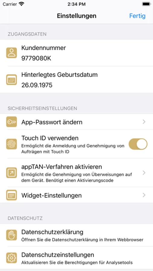 Unser InternetBanking verwendet sicheres HTTPS für den Verbindungsaufbau. Sie schützen die App mit einem Passwort oder können alternativ Ihren Fingerabdruck oder die Gesichtserkennung zur Authentifizierung verwenden. Bei Einrichtung der App müssen Sie einmalig Ihre Kundenummer, Ihre PIN und Ihr komplettes Geburtsdatum hinterlegen. Beim Login ist gemäß PSD2-Richtlinie alle 90 Tage eine TAN-Freigabe erforderlich.