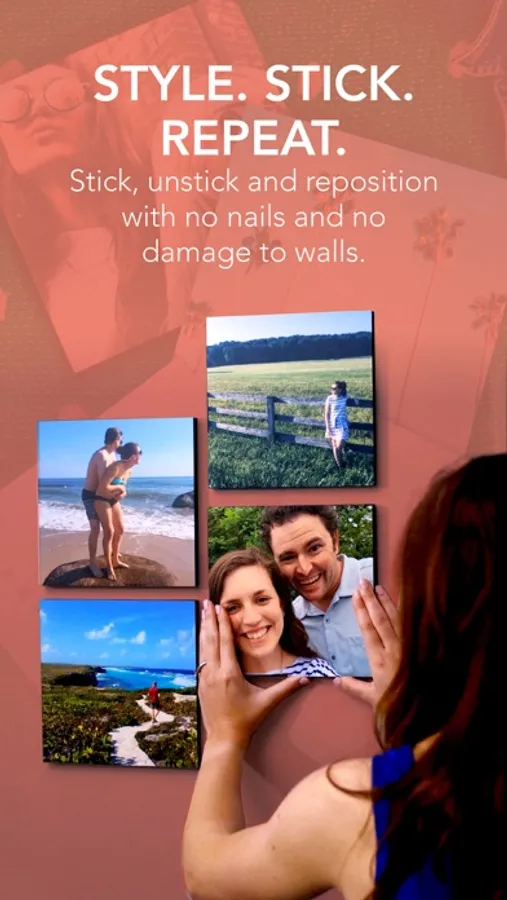 Our high-quality, foam-core backed PhotoSquares are created using the latest in printer technology and are UV and moisture resistant. A special double-sided adhesive sticks to any surface so you can hang them, and re-hang them, without damaging your walls or the squares. Perfect for apartments, dorm rooms, living rooms, bedrooms, or anywhere else you can hang a picture!
