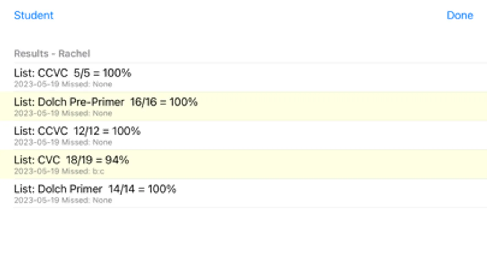 Mystery Words keeps track of your child’s scores. Data is collected by entering in a child’s name. It shows which letter they substituted by mistake by recording a score for correct verses incorrect letters. You can also see how many words they got correct and the percentage of correct words. You can then use the results to determine if your child needs more instruction on a certain letter sound.