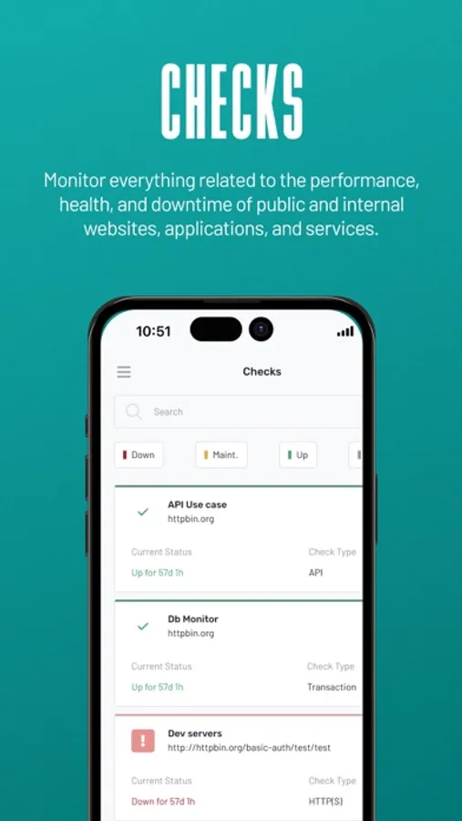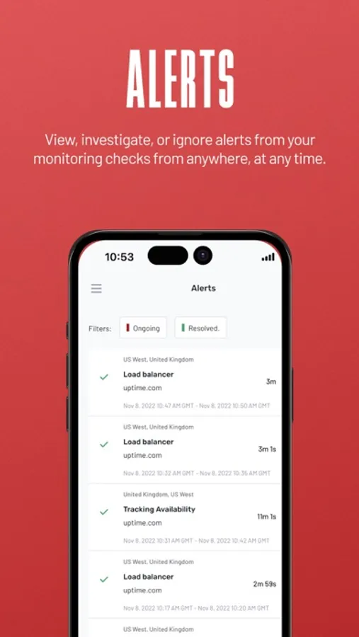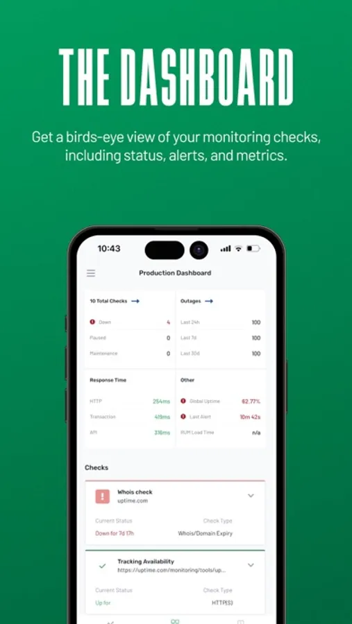 Uptime checks your website at one-minute intervals from 30 different locations across 5 continents. From our app, you can access your active checks, pause or resume a check, and access alert details.
