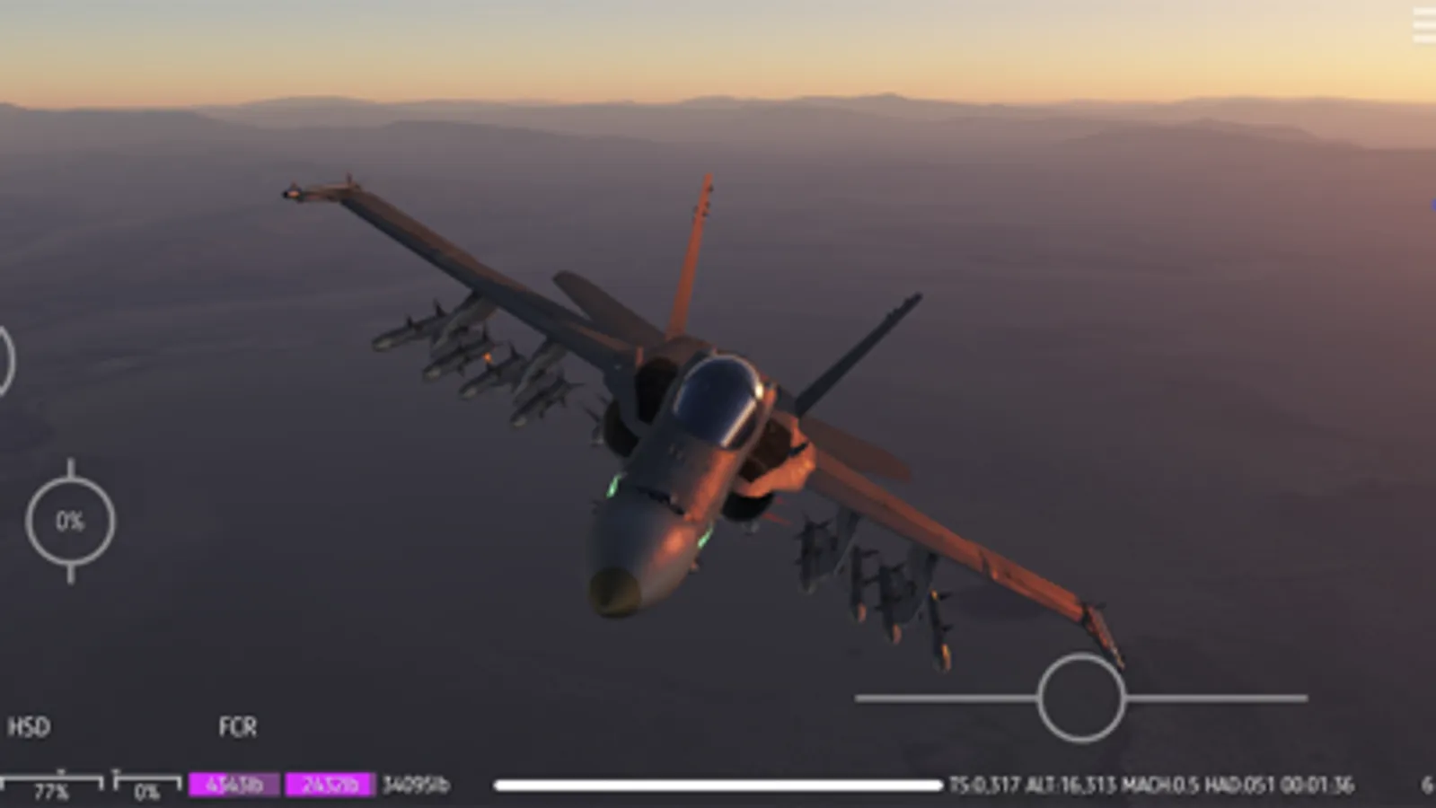 The aerodynamic model of each aircraft includes multiple components, with careful calculations of their inflow. As a result, the simulator realistically simulates the unique aerodynamic characteristics of many aircraft. This includes the high angle of attack maneuverability of F18 and F22, the ability of F14 to perform a full turn roll using only rudder, the pedal turn maneuver of F35 and F22, and the cobra maneuver of the Su series aerodynamic layout aircraft. The development process involved real pilots for testing and feedback.