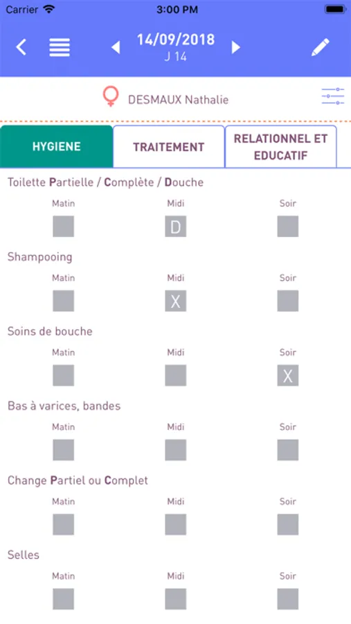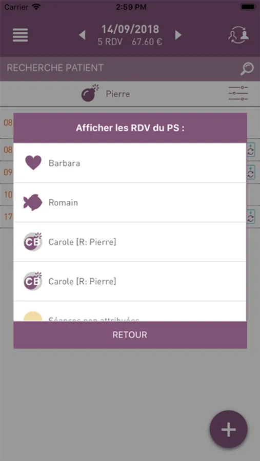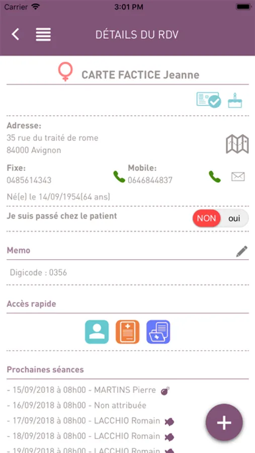 Tout au long de votre journée, vous retrouvez votre agenda, avec tous vos rendez-vous, et leur détail. Leur gestion est facilitée : les rendez-vous effectués passent dans une autre couleur, et vous pouvez indiquer les rendez-vous non faits, afin de les retirer de la facturation.