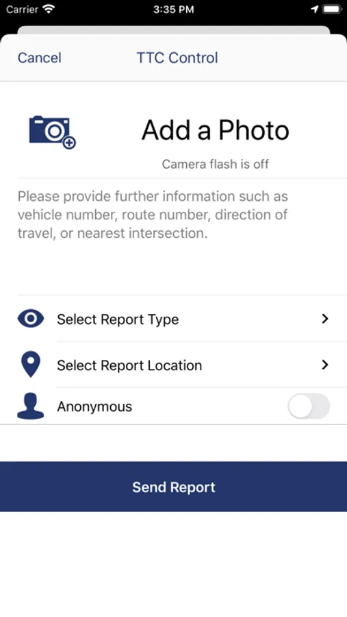 - The “Report a Problem” button allows users to send text and photos or videos directly to Transit Control. When reporting an issue, customers can select from easy drop-down menus for vehicle type (bus, streetcar or subway), route numbers, and station locations, and report categories to assist Transit Control in assessing the situation.