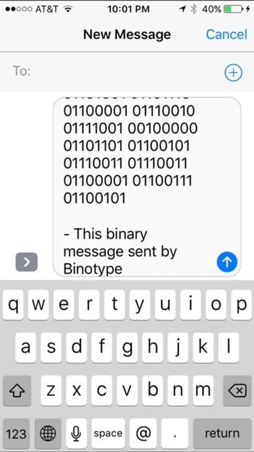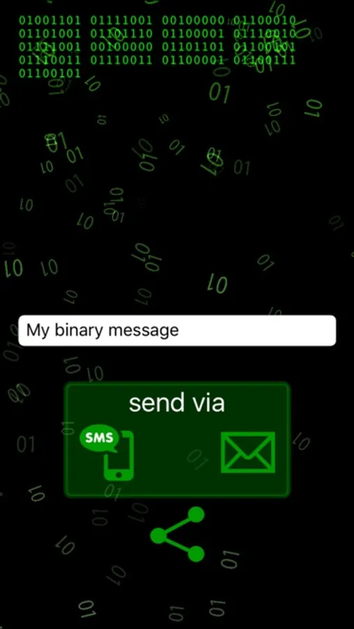 The ultimate geek's typewriter, Binotype translates everything you type into binary in real time! Once you've finished typing your message, hit the share button to send your binary message via SMS or email. Impress and amaze your friends! Or just confuse them! Either way, you'll be 01010010 01001111 01010100 01000110 01001100 00100001 (ROTFL!)