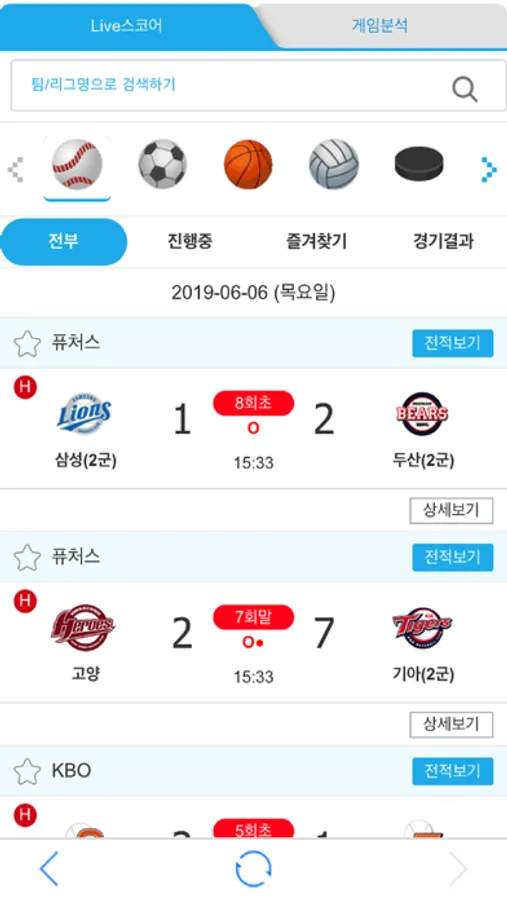 ▷ 스포츠 주요경기 실시간상황을 한눈에 확인 가능