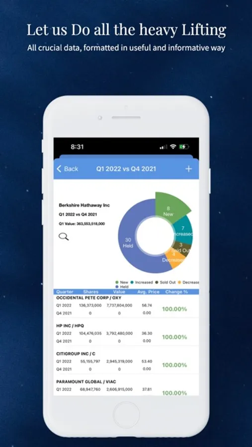 - Interactive charts to compare the current and prior quarter of Form 13F, along with summary of all the changes in the portfolio.