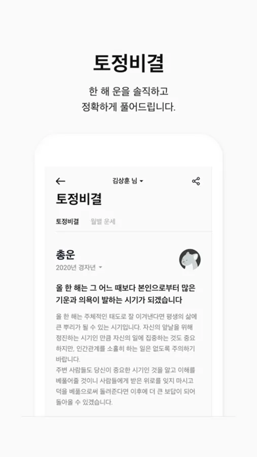 회원가입 후 입력한 사주 정보에 따라 오늘의 운세, 띠 운세, 별자리 운세, 토정비결, 사주 결과 확인이 가능합니다.