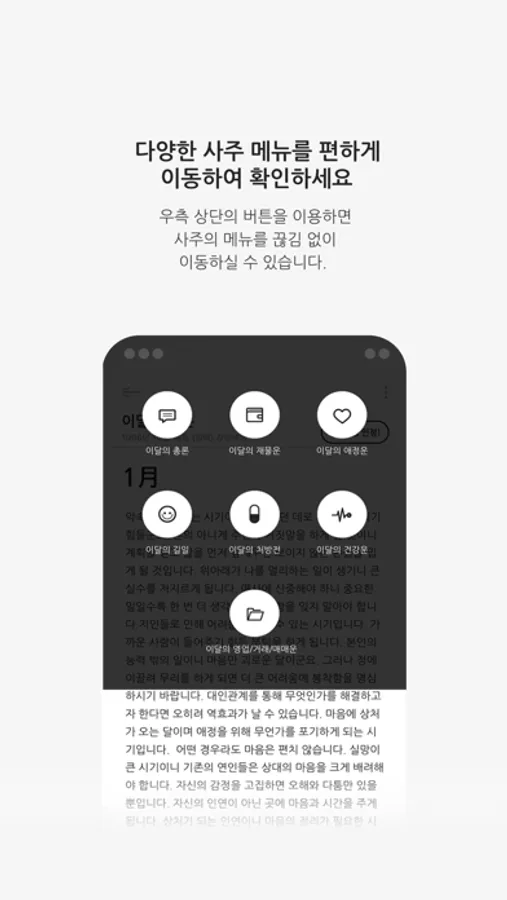 여러분의 고민과 궁금증에 대해 친절하고 상세하게 풀어드립니다. 오직 당신을 위한 ‘백점문’은 인생 전반에 걸친 총운과 성격, 재물, 건강 등 다양한 운세를 검증된 사주 전문가들이 직접 알려드릴 것입니다.