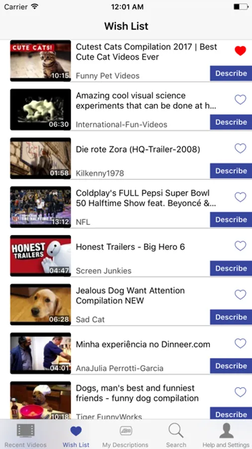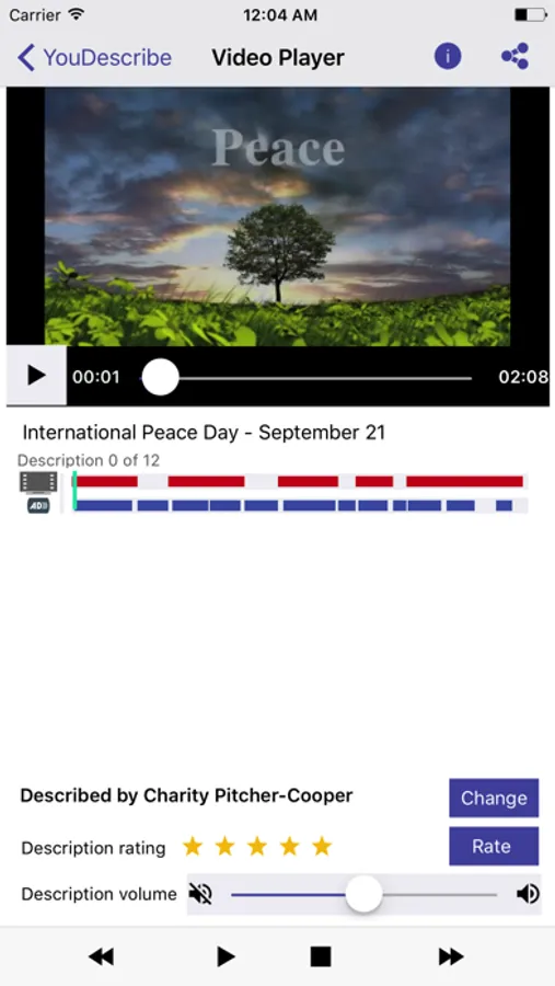 The YouDescribe app gives blind and visually-impaired viewers convenient mobile access to a rapidly growing collection of YouTube videos with audio description -- an extra soundtrack added by a describer to tell the viewer about text, illustrations, setting, gestures and facial expressions that are otherwise not accessible to blind viewers, or to otherwise aid viewers who benefit from additional description to understand the video content. The YouDescribe app for iOS lets you choose from thousands of YouTube videos described by our global community of contributors. The app also lets you request descriptions for YouTube videos that have not yet been described, and rate descriptions that have already been created.