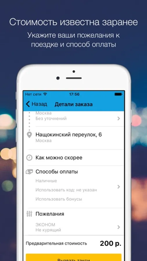 Приложение рассчитает стоимость поездки ещё до посадки и автоматически рассчитывает кратчайший путь - дешево и быстро. В ситуациях, когда неудобно говорить по телефону (кинотеатр, совещание, клуб, аэропорт, библиотека) — можно заказать авто в 2 клика и за считанные секунды.