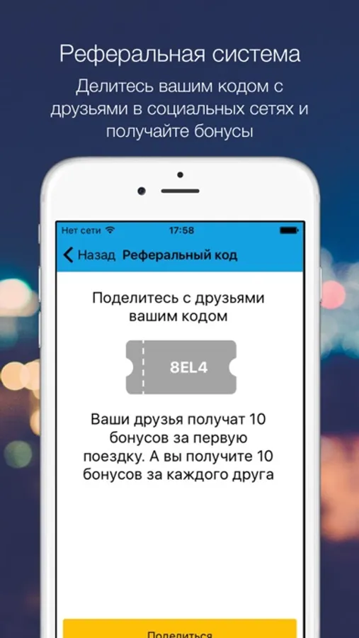 Оплачивайте поездки по карте, наличными или накопленными бонусами. Делитесь вашим личным рефератным кодом с друзьями и получайте бонусы на счет для будущих выгодных поездок