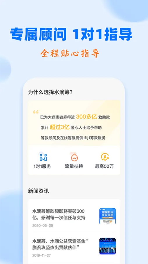 水滴筹是由水滴公司推出的重大疾病爱心筹款平台,可为每位大病患者提供1对1筹款指导。家庭经济困难的大病患者可以发起大病筹款,分享到微信朋友圈或QQ等平台,大病患者发起筹款审核通过后,可快速筹到治病钱。水滴汇聚,终成汪洋,筹款就用水滴筹!