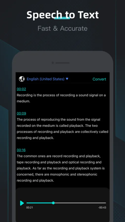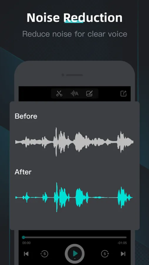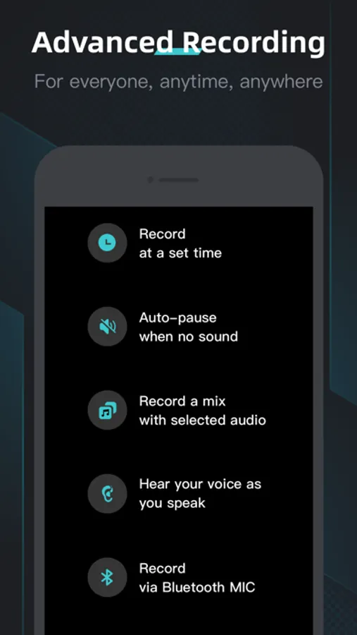 For your advanced needs, we developed “Speech to text”, “Noise reduction”, and “Monitor” features so that you can convert speech to text, reduce noise for clearer voice, and listening while recording.