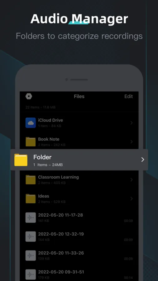 Manage recordings by categories, Folders, Favorites, Trash, also built-in search and sort features.
