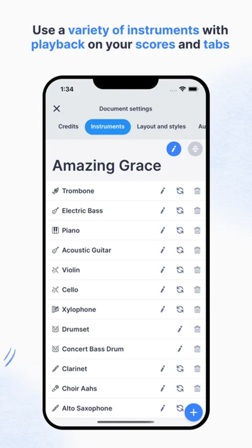 • Layout and styles: Page dimensions, Spacing between score elements, Chords style, Jazz/Handwritten music fonts...