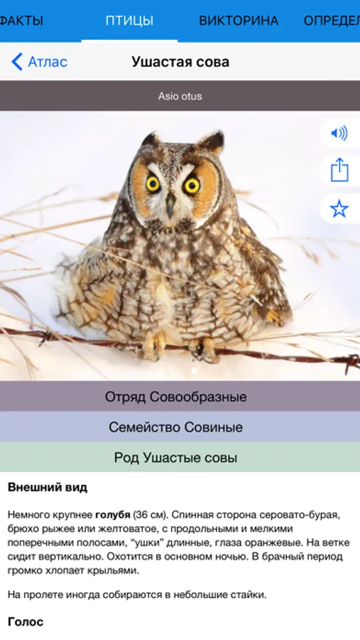 Атлас представляет собой коллекцию птиц с сопутствующими текстовыми описаниями, а также ссылками на отряды, семейства и рода, к которым относится данный вид птицы. Тут же есть Поиск птиц и ваши Избранные виды.
