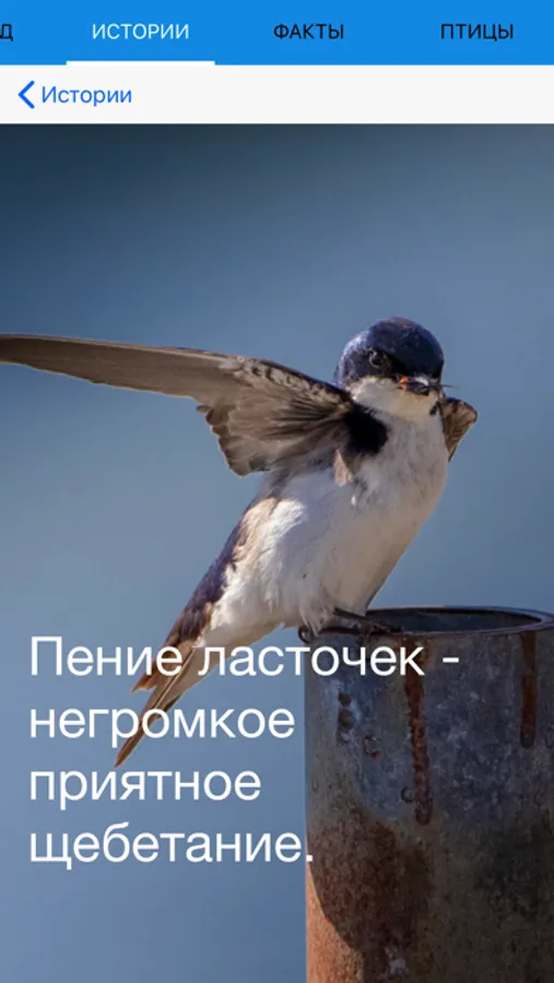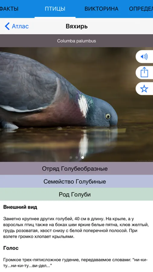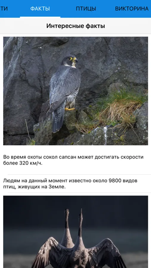 В приложении также есть: Викторина (определение птиц по фотографии), Дневник наблюдений (функция для любителей наблюдения за птицами - bird watching - позволяющая записывать встреченные виды), Интересные факты о птицах.