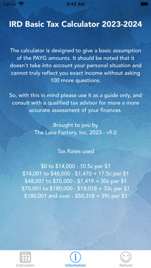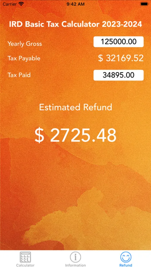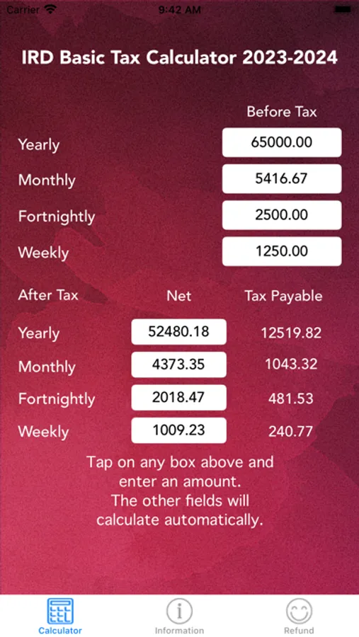 A simple tax calculator. Now includes a tax refund calculator. If you have been offered a new job, been given a yearly rate and want to calculate what will end up in your pocket then this app is for you. Also, maybe you know what you get paid each fortnight but need to calculate your yearly gross income, then again, this app is for you. It doesn't take into account the 100 or so questions a tax advisor would ask, but gives a basic PAYG assumption based on the current Inland Revenue Department tax tables. Type values into any field and it will calculate the others.