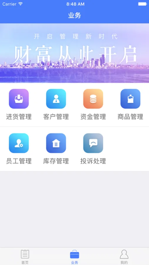 2.业务:业务界面中有通知,新订单,新开户,全部客户资料,投诉处理等等功能,用户可以根据自己的需求进行相应的操作。
