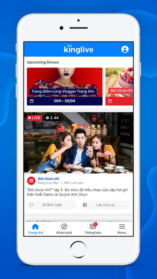 KingLive là kênh livestream hàng đầu trực tiếp cập nhật nhanh chóng, kịp thời, liên tục các thông tin, xu hướng, sự kiện về đời sống – xã hội – giải trí mà giới trẻ quan tâm. Đây cũng là nơi bạn dễ dàng gặp gỡ các ngôi sao nổi tiếng và được tương tác trực tiếp với thần tượng của mình qua nhiều chương trình mới mẻ, thu hút.