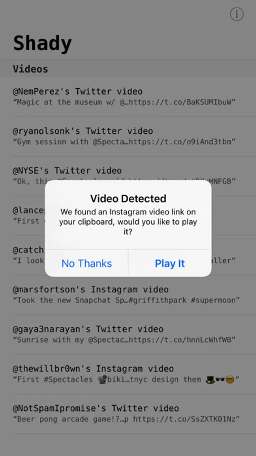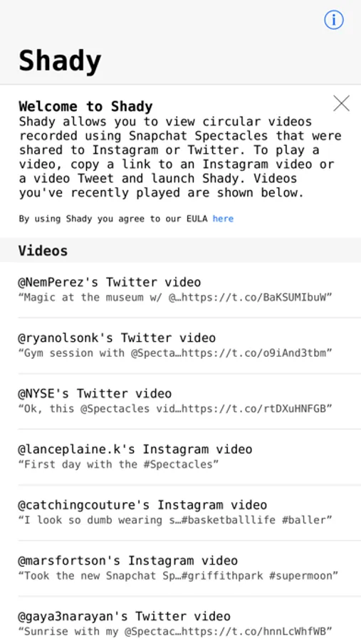 Shady is an app for playing circular videos recorded with Snapchat Spectacles that were shared to Instagram and Twitter. Copy a link to an Instagram or Twitter video and launch Shady to play the video, then pan the device around to get a better look!