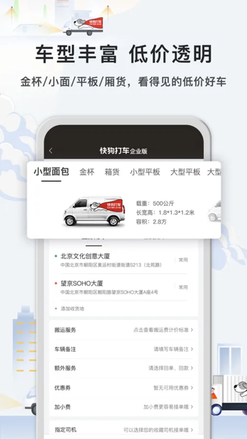 快狗打车企业版(原58速运企业版),企业专属叫货车APP,为各行业货运提供专业物流运输管理解决方案,用心服务百万企业!