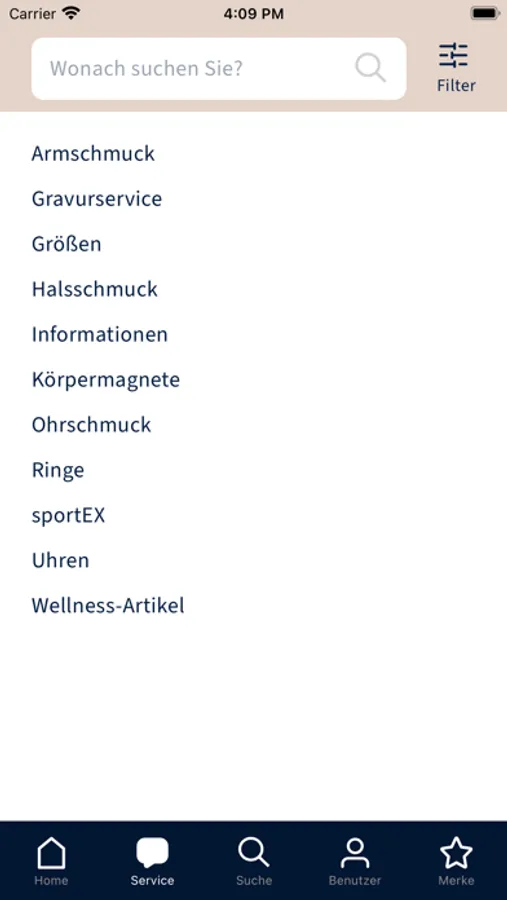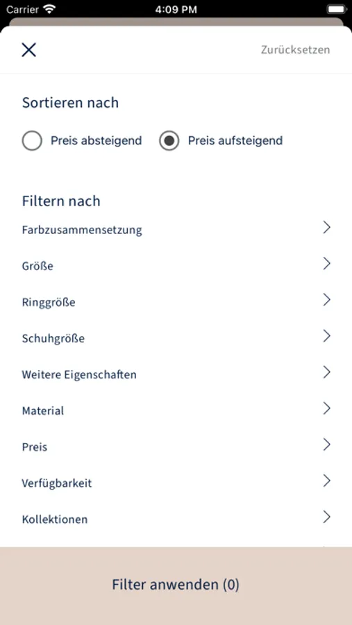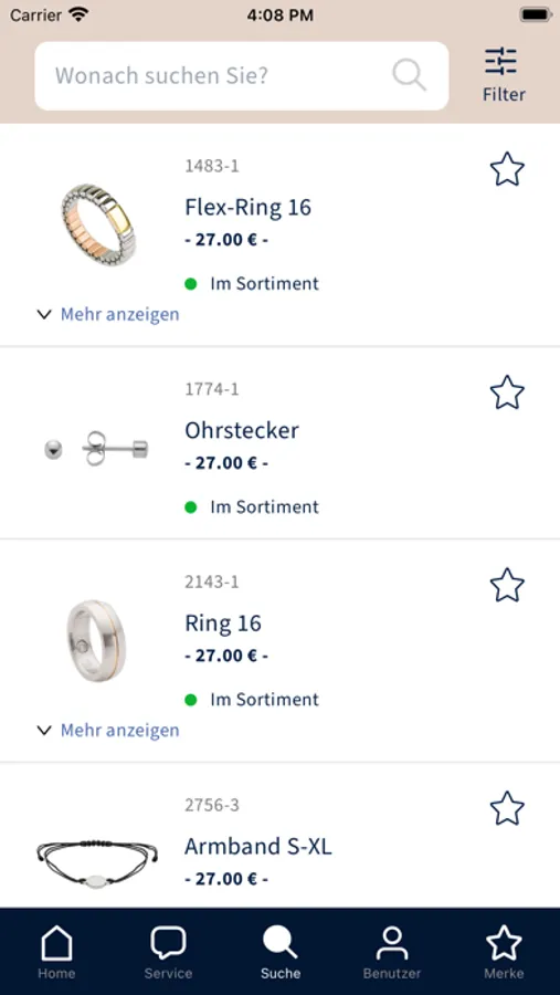 Wählen Sie zwischen verschiedenen Sprachen und Währungen. Suchen Sie nach der Artikelnummer oder der Beschreibung und filtern Sie zusätzlich nach Größe oder Farbe.