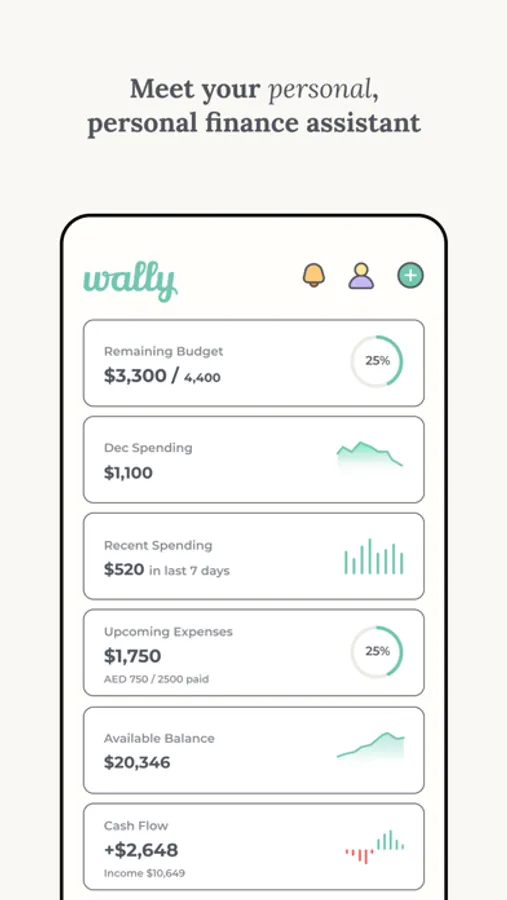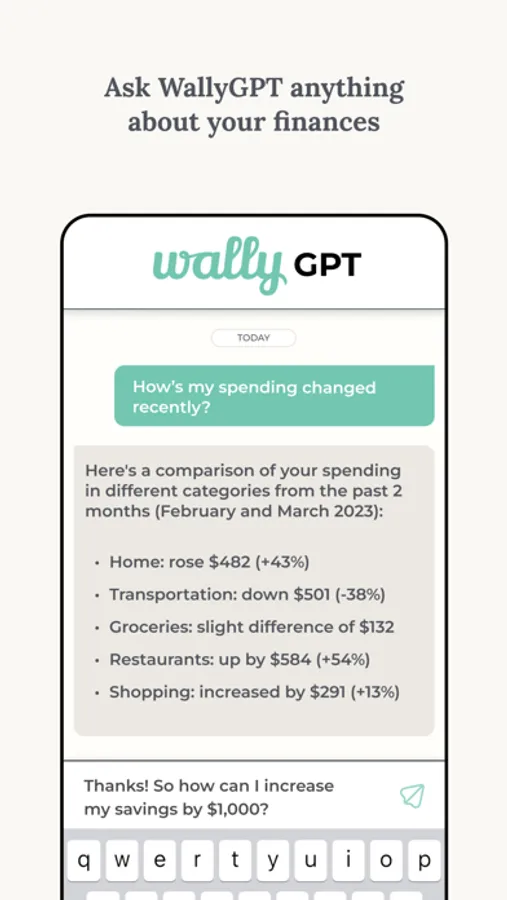 Get started today with your own personal finance AI. WallyGPT enhances your finances with personalized thoughts across charts in the app and can help you start a conversation with customized questions. You'll love having your own advisor with the ability to set budgets for you that you can track daily.