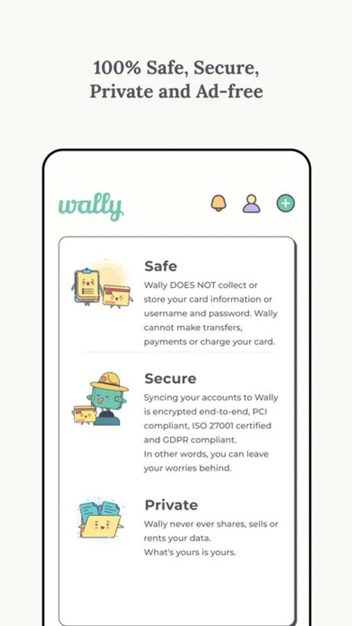 ◆ Secure: Connecting your accounts to Wally is encrypted end-to-end, PCI compliant, ISO 27001 certified and GDPR compliant.