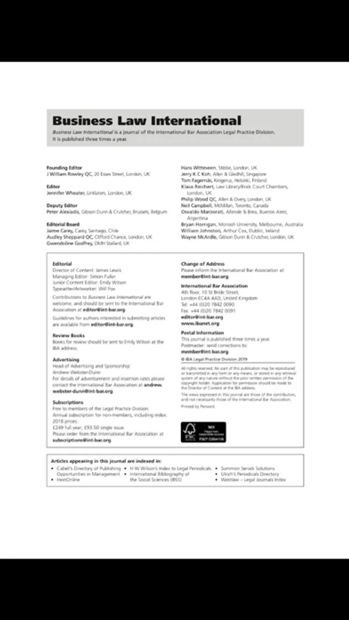 The IBA provides members with access to leading experts and up-to-date information, as well as top-level professional development and networking opportunities through publications and conferences. Business Law International is published by the IBA’s Legal Practice Division.