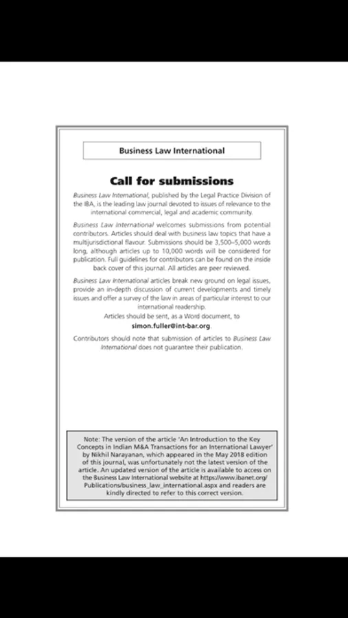 Business Law International addresses key issues in all practice areas of relevance to the commercial, legal and academic community. Subjects covered include: corporate corruption, human rights, finance, mergers and acquisitions, environmental issues, taxation, employment, competition and intellectual property.