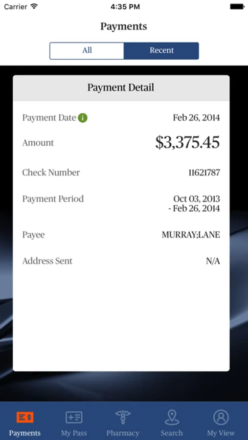 Ability to view Claim payment details such as payment date, amount, check number, payee and address information.