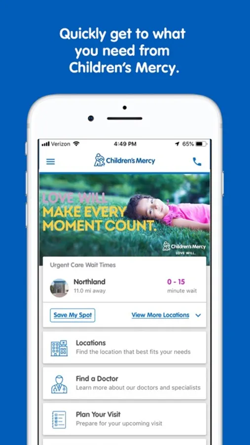 When your child is hurt or sick, your first priority is getting them the care they need as quickly as possible. With the Children’s Mercy app, you can find the nearest urgent care location, see wait times and save your spot in line, all without leaving the comfort of your own home. Make the living room your waiting room--we’ll text you to head in for your scheduled time.