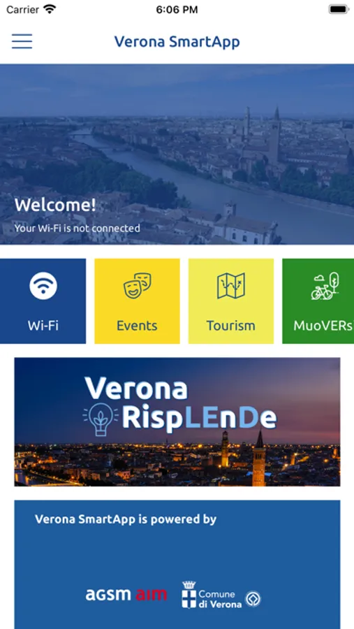 Verona SmartApp allows you to connect to public WiFi - a unified network providing free, unlimited high-speed internet access - and is set to become the official aggregation point for services and information on the City of Verona. An app for citizens and visitors, a virtual place where to find what you need, and make life in the city easier and more fun.