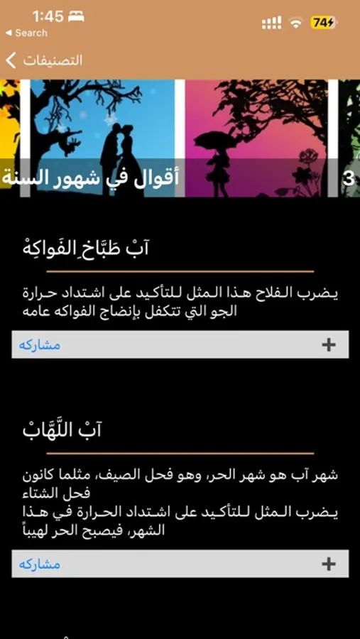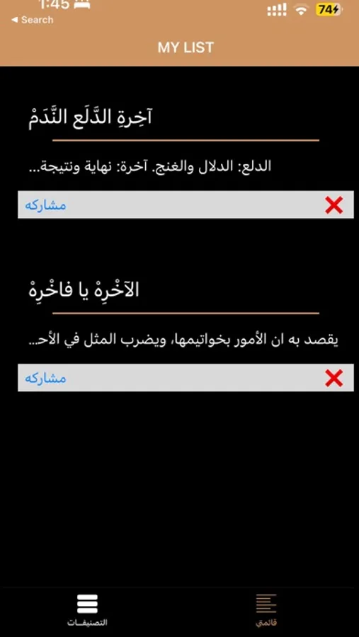 يمكنك في هذا التطبيق أيضا مشاركة الأمثال مع أصدقائك وإضافتها للمفضلة