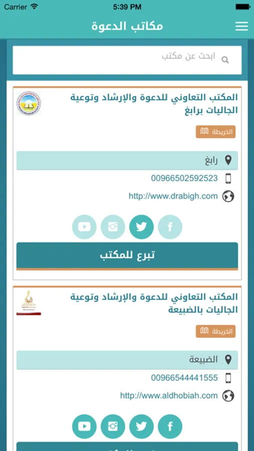 التطبيق يسهل الوصول لبيانات مكاتب الدعوة على مستوى المملكة, سواء أرقام تواصلها أو عناوينهم على الخريطة أو صفحات التواصل الاجتماعي الخاصة بهم, فتتمكن من التواصل معهم ومتابعة أنشطتهم الدعوية في أي وقت.